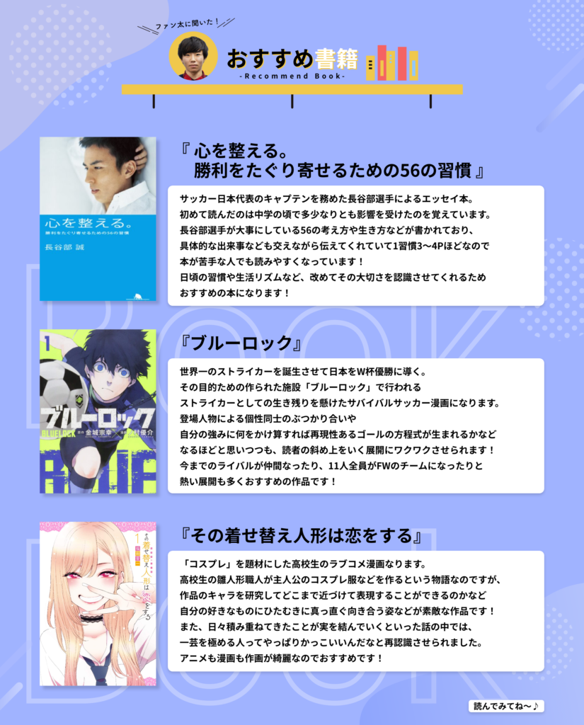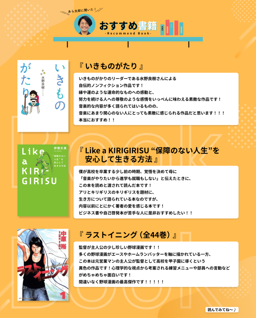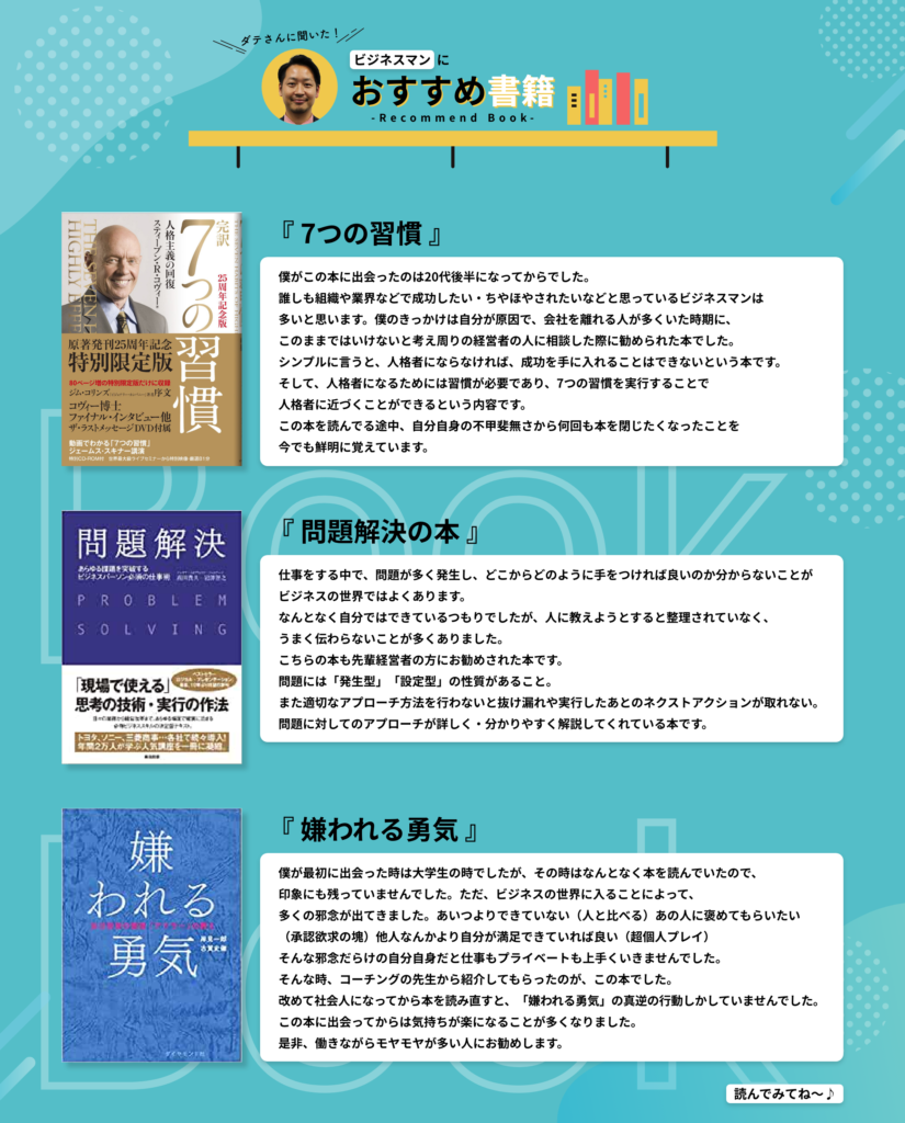 こんにちは、人事の菅野です!今回は、社員のみなさんにおすすめの書籍(漫画を含む)を紹介していただきました。悩んでいる時・決断をした時など、成長や大きな環境の変化のタイミングで出会った書籍も多く紹介されています。皆さんの力になるような、背中を押せるような書籍との出会いとなれば幸いです。ぜひご覧ください!
