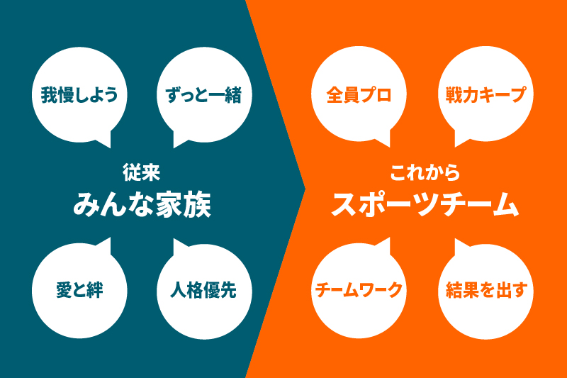改めて「家族」という言葉を捨て「スポーツチーム」という考え方に切り替えます。これは容易なことではないと思っています。