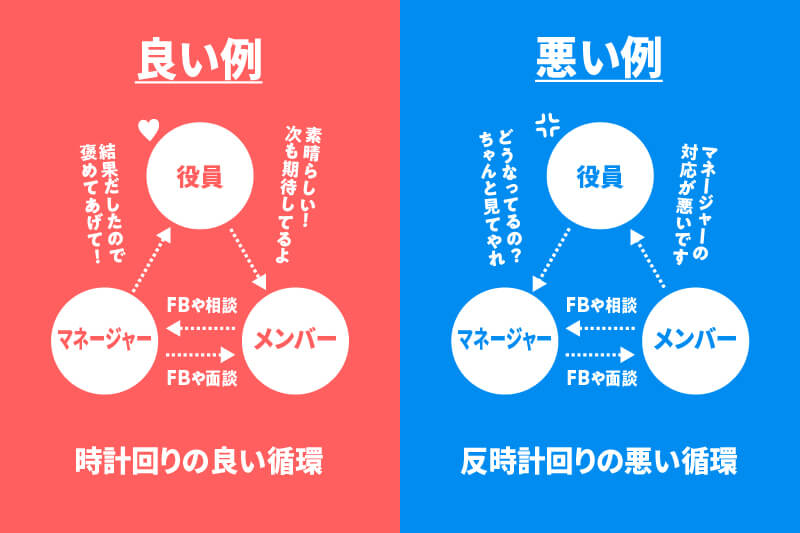 この図で描かれている通り、3階層しかないため、明確なトライアングルになります。とはいえ、時計回りの循環が生まれるためにはマネージャーの手腕が問われます。よくも悪くも役員など経営側との距離が近いというのが特徴です。